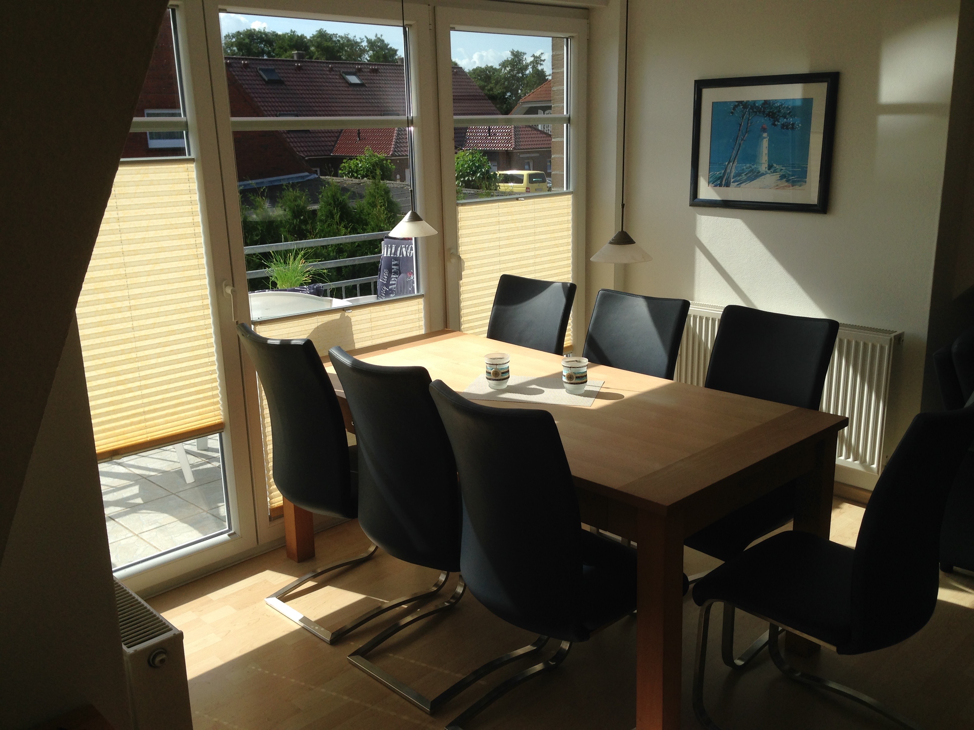 Der Essbereich befindet sich direkt am Zugang zum Balkon. Ein Kinderhochstuhl ist selbstverständlich vorhanden.