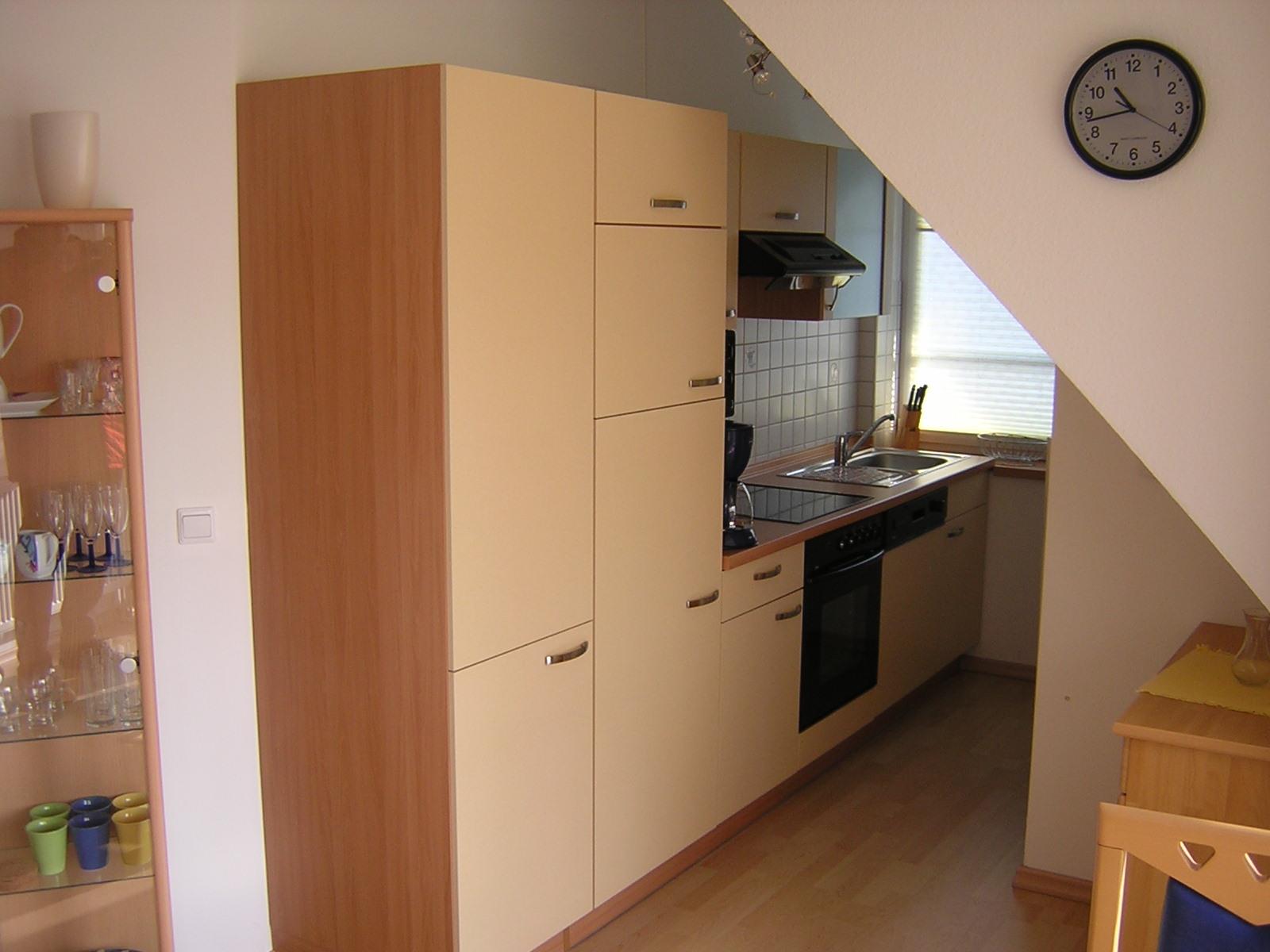 Der Küchenbereich ist komplett mit Mikrowelle, Geschirrspüler, Kühlgefrierkombination sowie Elektroherd ausgestattet.